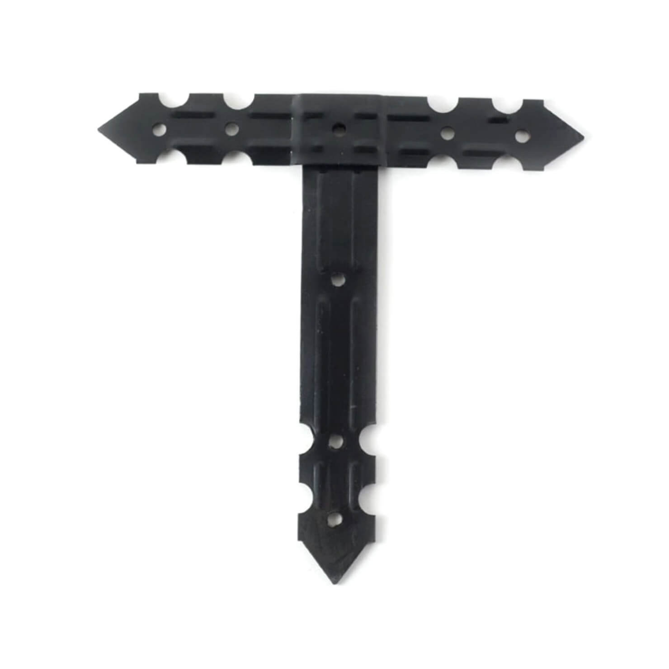 Декоративната T-образна планка от две части е създадена за стилно и здраво свързване на дървени елементи под прав ъгъл. Изработена от високоякостна стомана и покрита с прахово боядисване в черно, тя съчетава устойчивост на атмосферни влияния и модерен външен вид. Двуделната конструкция позволява лесен монтаж и адаптация към различни дебелини на дървения материал.